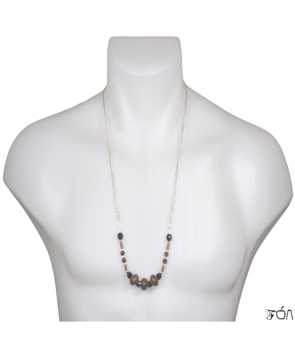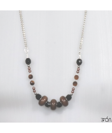 Plus de détails : 3 rondelles en bois ciré (Philippines) avec 1 centre en métal argenté (15 mm) ; 6 cristaux de Swarovski transparents (3 mm) ; 1 fil de Nylon (0,50 mm) ; {en métal argenté :} 4 boules (12 mm) ; 2 anneaux ovales (8 mm) ; {en verre :} 6 perles ovales facettées noires (8 mm) ; 8 perles nacrées marrons (3 mm) ; {en Argent 925 :} 4 boules (4 mm) ; 1 chaîne maille Gourmette 3 mm (55 cm) ; 2 perles à écraser (2 mm) ; 2 embouts à écraser (8 mm).
