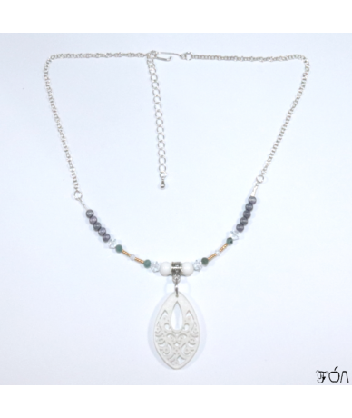Plus de détails : 6 cristaux de Swarovski transparents (4 de 5 mm et 2 de 3 mm) ; 1 pendentif goutte blanche en résine avec motifs arabesques (35 mm) ; 10 perles magiques grises (3 mm) ; 1 fil de Nylon (0.5 mm) ; {en Acier :} 1 bélière ornée (5*9 mm) ; 1 anneau rond (10 mm) ; 1 chaînette d'extension goutte (5 cm) ; {en Argent 925 :} 2 coupelles fleurs (5 mm) ; 2 perles à écraser (2 mm) ; 2 embouts à écraser (8 mm) ; 4 anneaux ronds (5 mm) ; 1 chaîne maille jaseron fin 2.5 mm (12 cm*2) ; 1 fermoir crochet 15 mm) ; {en Plaqué Or :} 20 perles (1 mm).